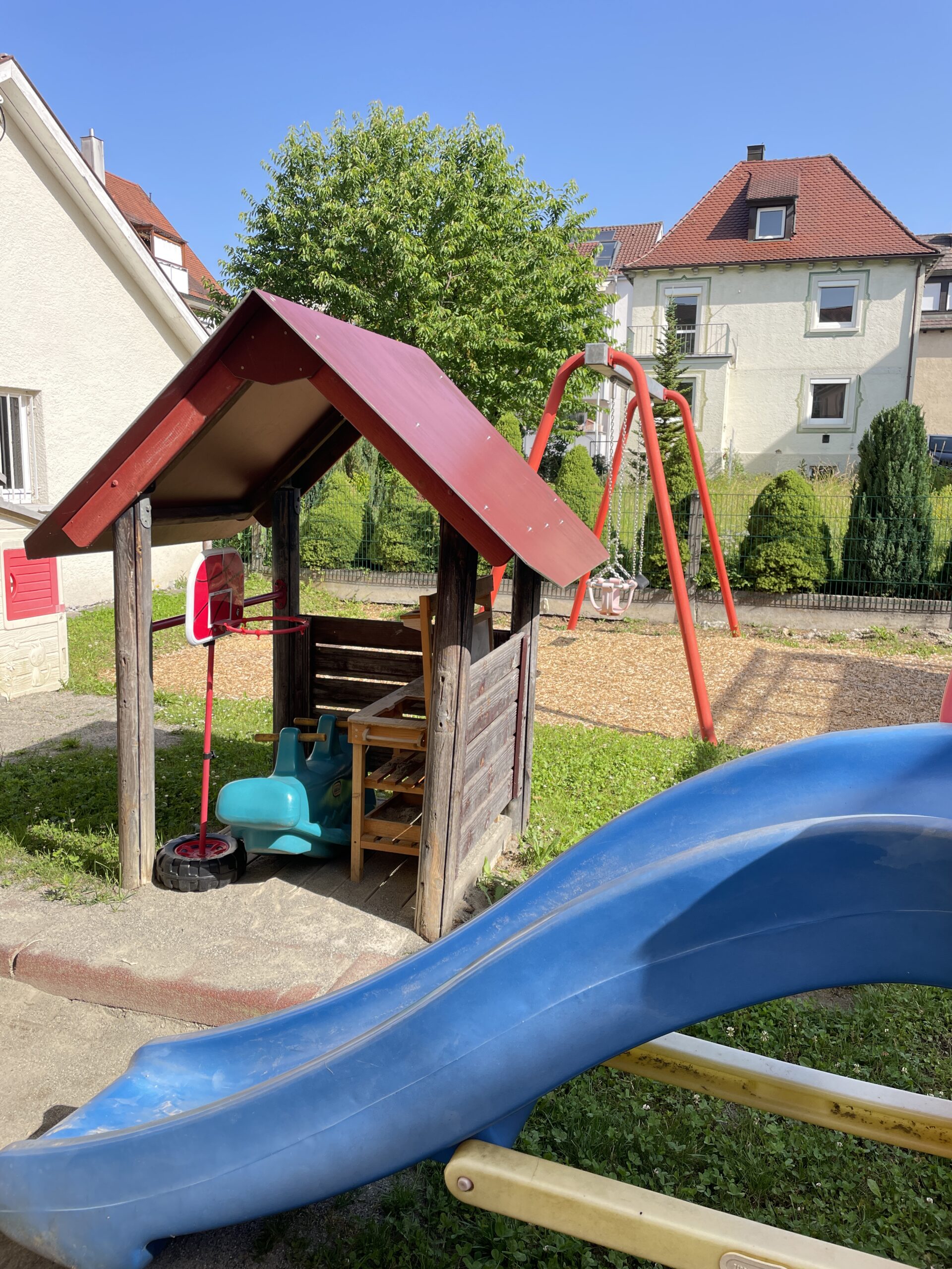 Ab nach draußen! Bei gutem Wetter nutzen wir unseren hauseigenen Spielplatz. Hier können die Kinder auf der Wiese flitzen, im Sandelbereich backen oder auf der Kleinkindschaukel und der Rutsche ihre Geschicklichkeit testen.