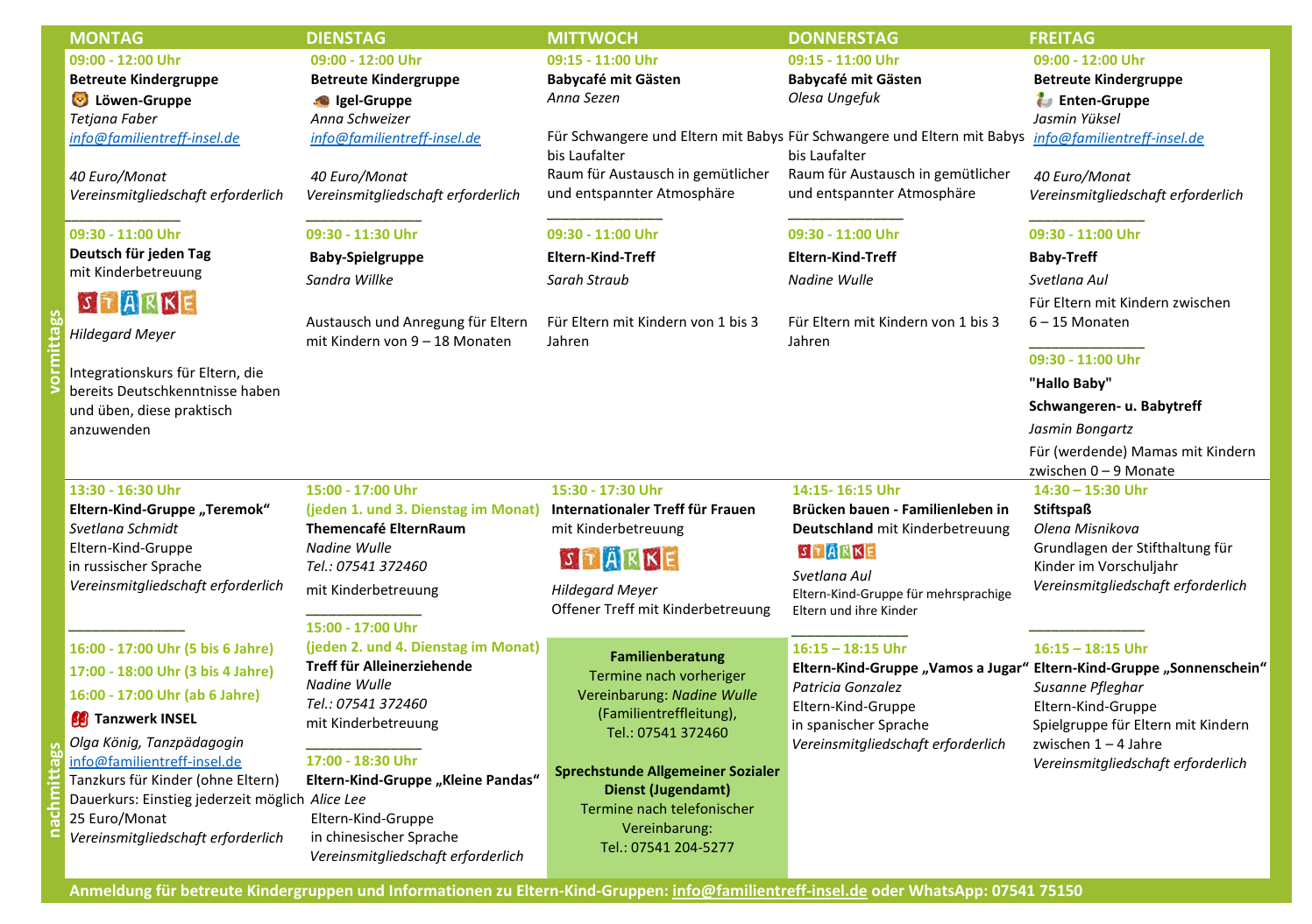 Hier findest du den aktuellen Wochenplan Familientreff INSEL. In unserem Wochenplan zeigen wir dir alle Angebote für Familien in Friedrichshafen. Unser Wochenplan Familientreff INSEL hilft dir, kein Angebot zu verpassen.